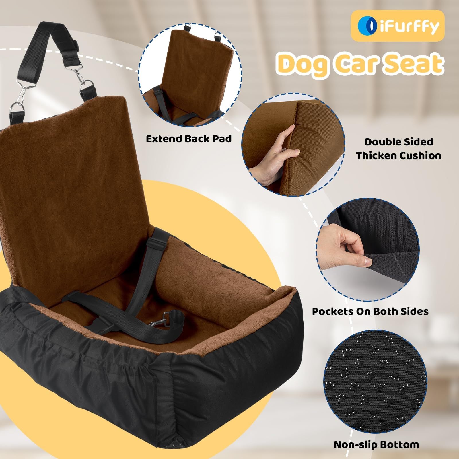 SAFETY & SECURITY: We prioritize the safety of both your dog and you as the driver. IFurffy car seat for dogs are designed with this in mind, featuring four adjustable strap ( including headrest, back, car belt buckle, and dog collar) and durable stainless steel rust-proof latches. With this dog seat for car, you can rest assured that your furry friend will remain secure and stationary while you focus on the road ahead
